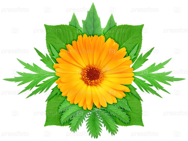 Оранжевый цветок среди зеленых листьев на белом фоне