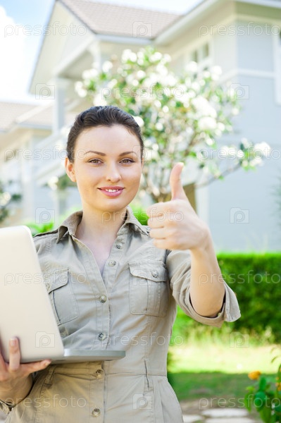 Женщина агент по продаже недвижимости с ноутбуком представляет красивый коттедж
