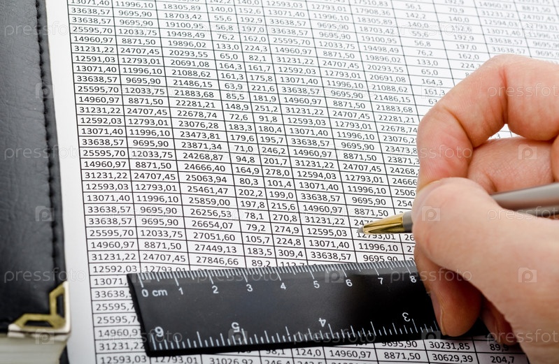 Рука с ручкой и линейка на фоне таблицы с цифрами