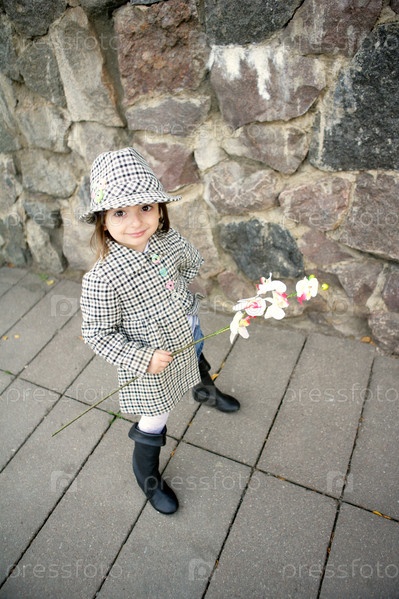 Маленькая девочка в сером осеннем пальто и шляпке держит в руке цветок