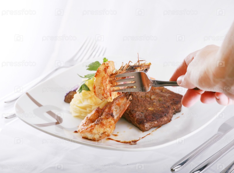 Стейк и креветки на тарелке