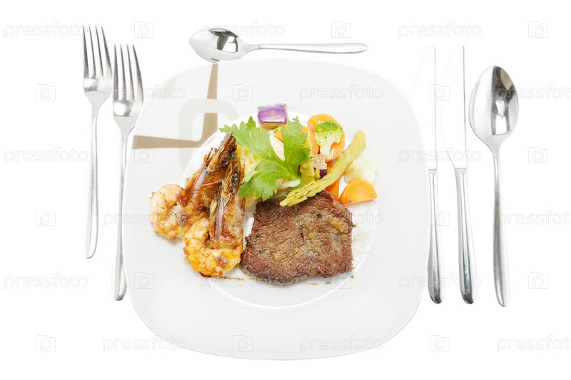 Стейк и креветки гриль с картофельным пюре и овощами