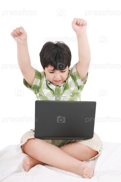 Милый маленький мальчик с ноутбуком в своей постели на белом фоне