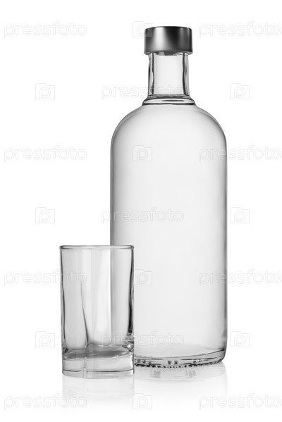 Бутылка водки и стакан на белом фоне