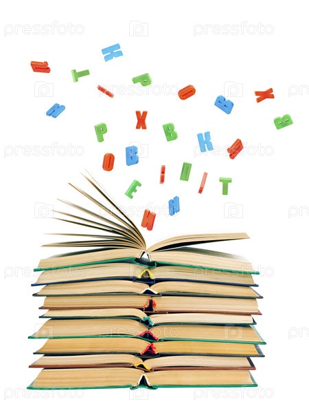 Разноцветные буквы летают над стопкой открытых книг на белом фоне