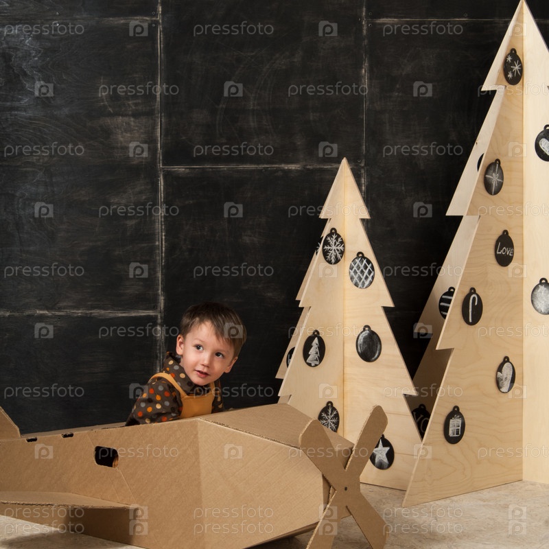 Маленький мальчик в картонных игрушках