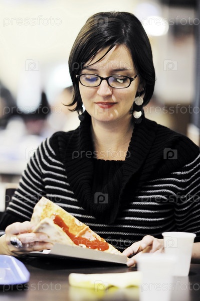 Молодая женщина ест пиццу