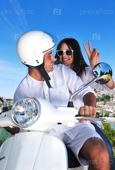 Счастливая молодая пара на скутере летом