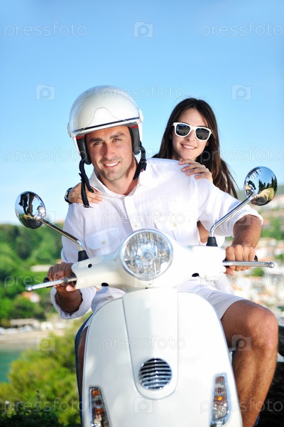 Счастливая молодая пара на скутере летом