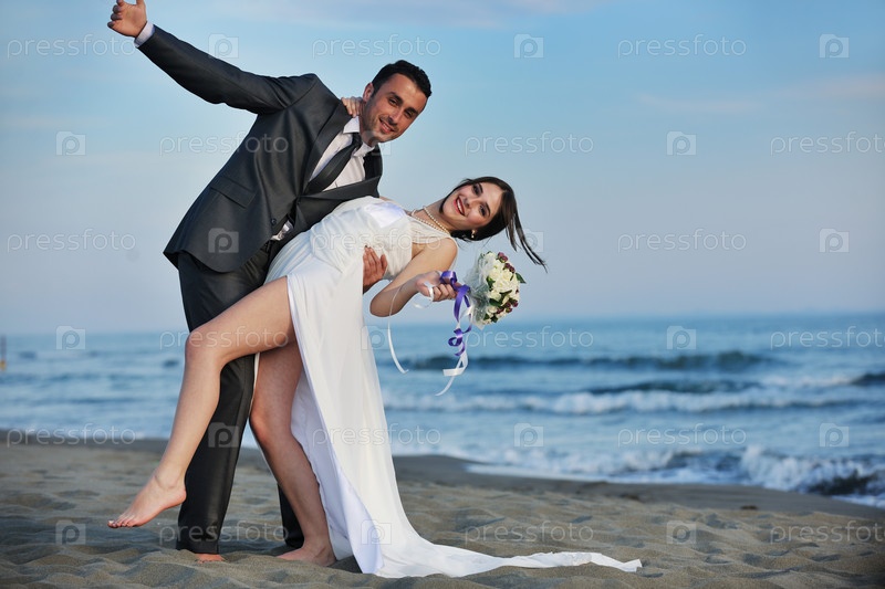 Красивые молодожены танцуют на берегу моря