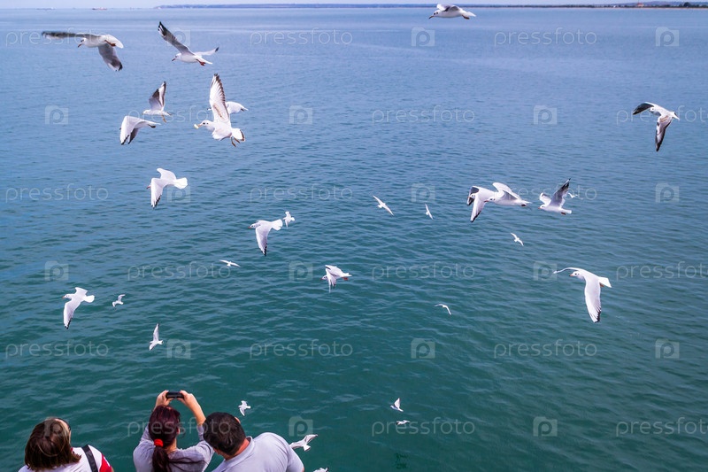 Семья из трех человек, наблюдая за чайками