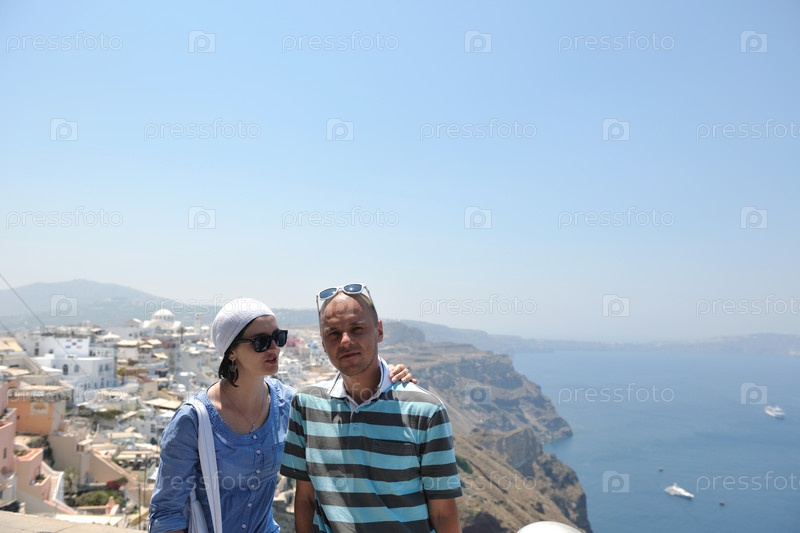 Молодая пара проводит летний отпуск в Греции на острове Санторини