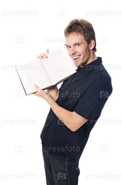 Молодой человек изолирован на белом с открытой книгой