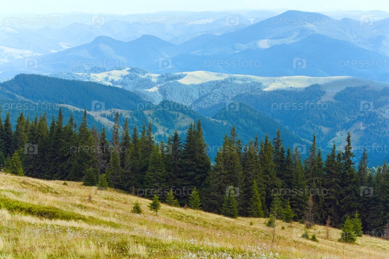 Летний туманный горный пейзаж с хвойным лесом на склоне, Карпатские горы, Украина