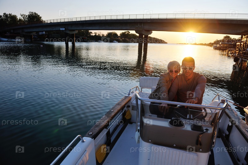 Молодая пара в лодке плывет по реке на закате