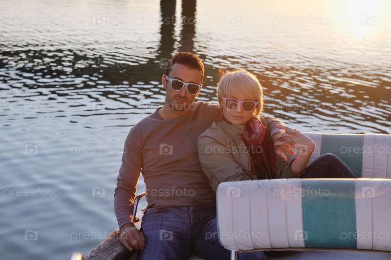 Влюбленная пара в лодке плывет по реке на закате