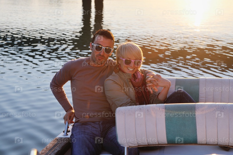 Влюбленная пара в лодке плывет по реке на закате