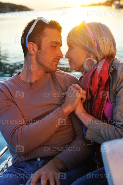 Молодая счастливая пара совершает романтическую прогулку на лодке