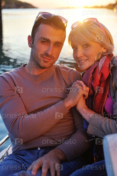 Молодая счастливая пара совершает романтическую прогулку на лодке