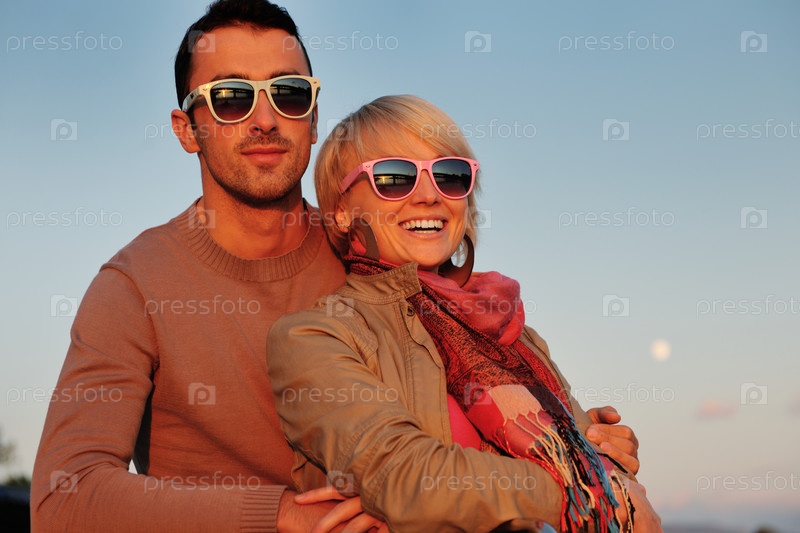Счастливая молодая пара на катере на закате