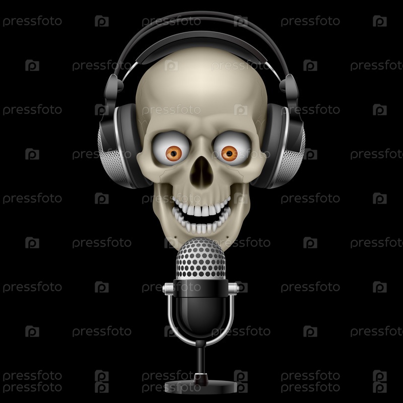 Череп с наушники с микрофоном на черном фоне