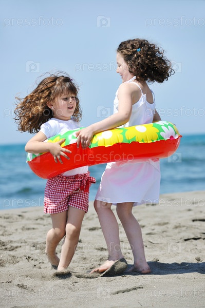 Две девочки играют с надувным кругом на пляже