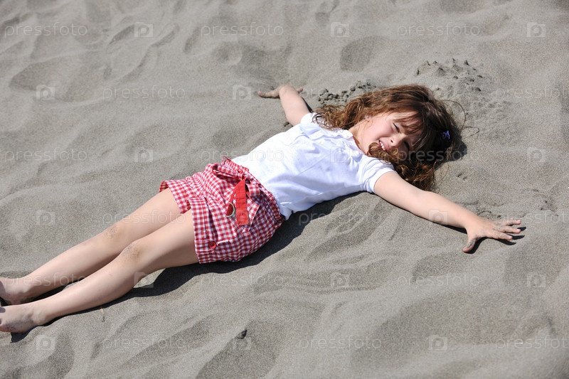 Портрет красивой маленькой девочки, лежащей на песке