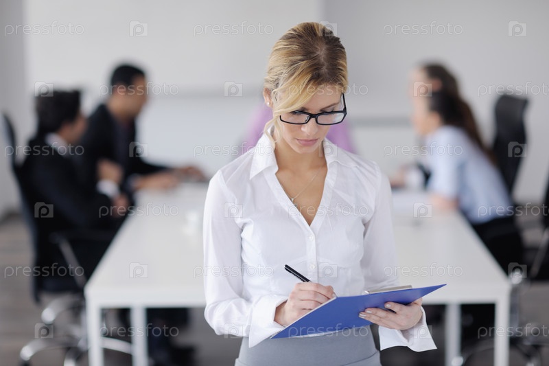 Успешная молодая деловая женщина на фоне своих коллег в офисе