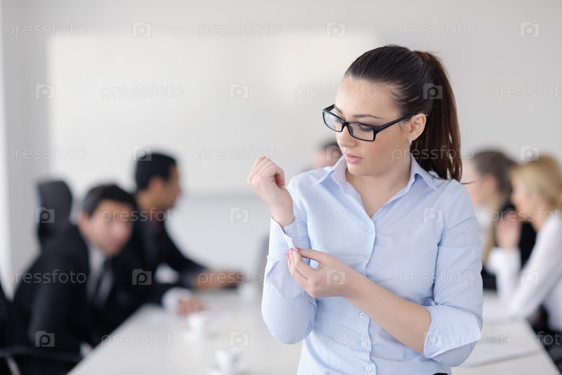 Успешная молодая деловая женщина на фоне своих коллег в офисе