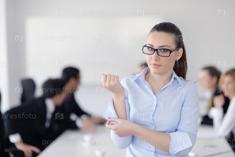 Успешная молодая деловая женщина на фоне своих коллег в офисе