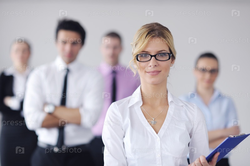 Красивая молодая деловая женщина на фоне своих коллег в офисе