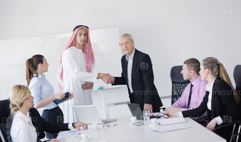 Молодой арабский бизнесмен на деловой встрече с коллегами