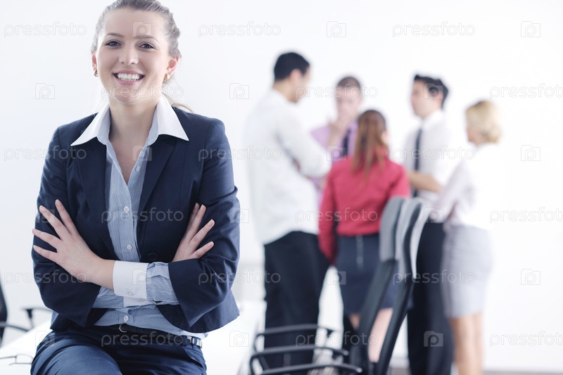 Красивая молодая деловая женщина на фоне своих коллег в офисе