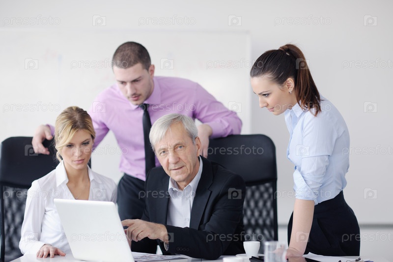 Пожилой деловой мужчина с тремя молодыми коллегами в офисе