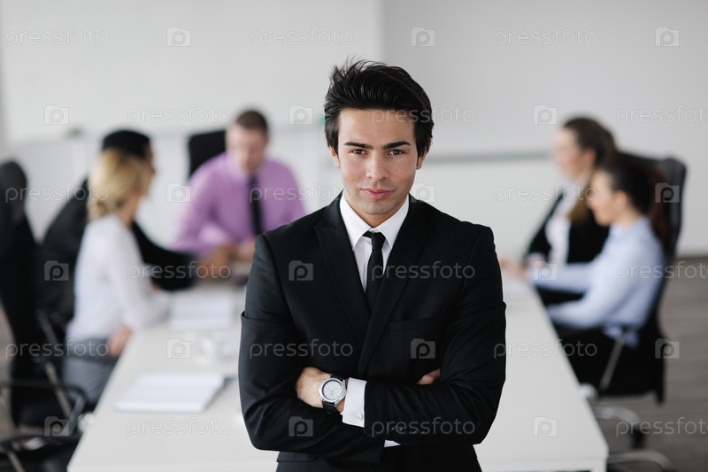 Молодой успешный бизнесмен на фоне своих коллег в офисе