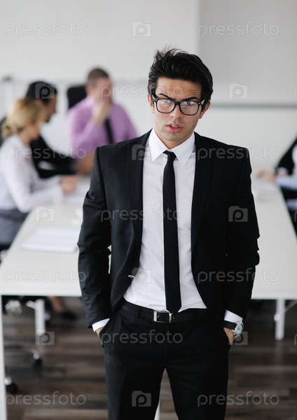 Молодой успешный бизнесмен на фоне своих коллег в офисе