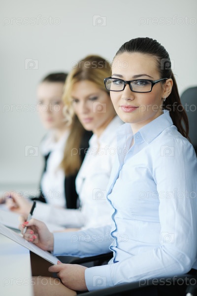 Молодая деловая женщина и ее коллеги на совещании в офисе
