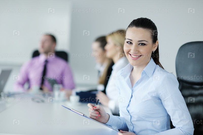 Молодая деловая женщина и ее коллеги на совещании в офисе