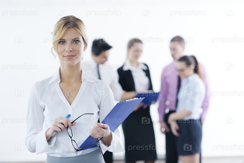 Молодая деловая женщина с планшетом и ее коллеги на заднем плане