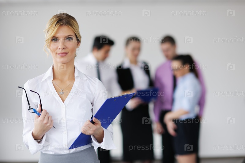 Молодая деловая женщина с планшетом и ее коллеги на заднем плане