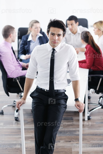 Молодой деловой человек на фоне своих коллег в офисе