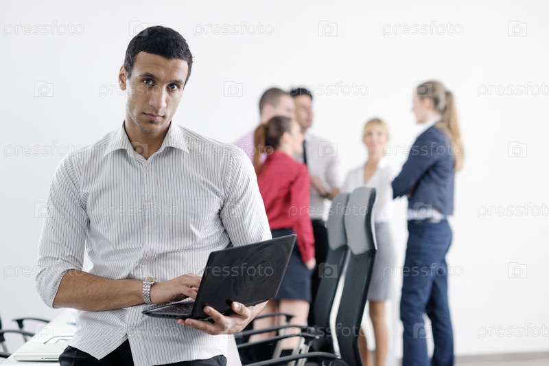 Молодой деловой человек с ноутбуком на фоне своих коллег