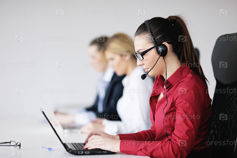 Молодые женщины с ноутбуком и гарнитурой работают в офисе