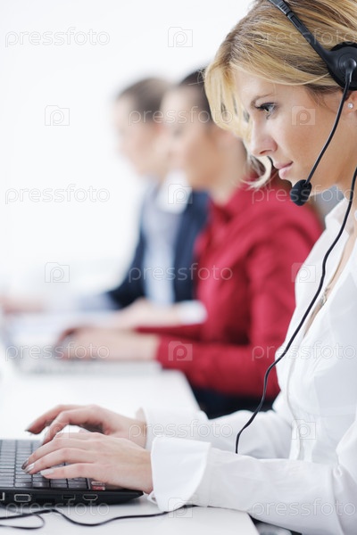 Молодые женщины с ноутбуком и гарнитурой работают в офисе