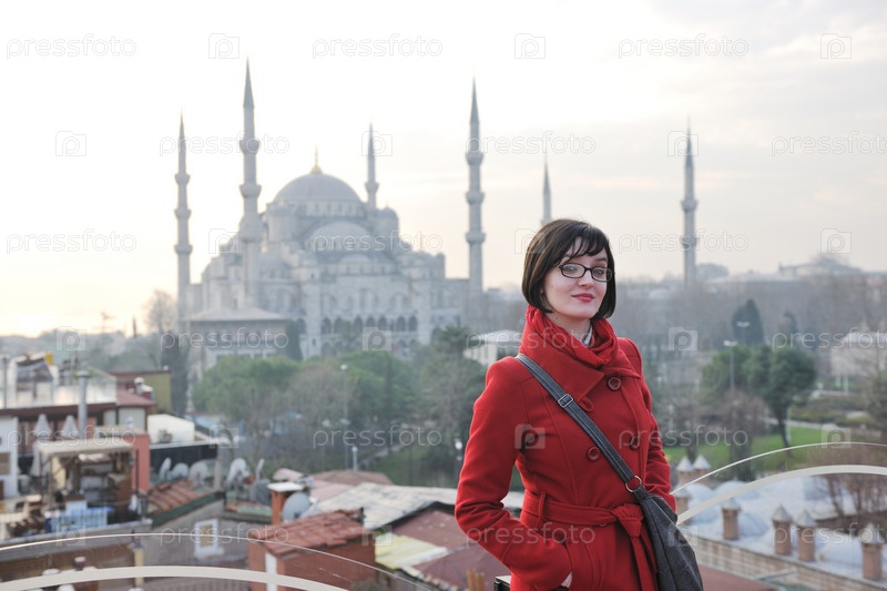 Счастливая туристка на фоне Голубой мечети, Стамбул, Турция