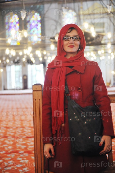 Счастливая молодая туристка в Голубой мечети, Стамбул, Турция