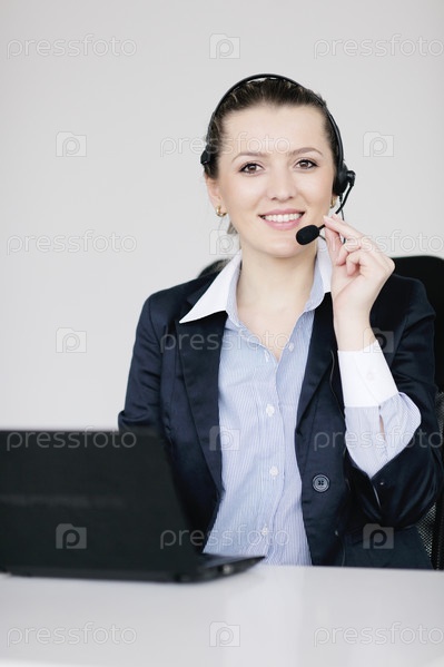 Улыбающаяся деловая женщина с гарнитурой, на белом фоне