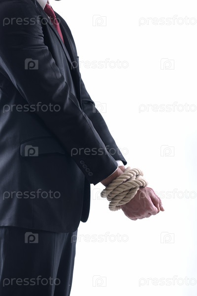 Деловой человек с завязанными руками на белом фоне