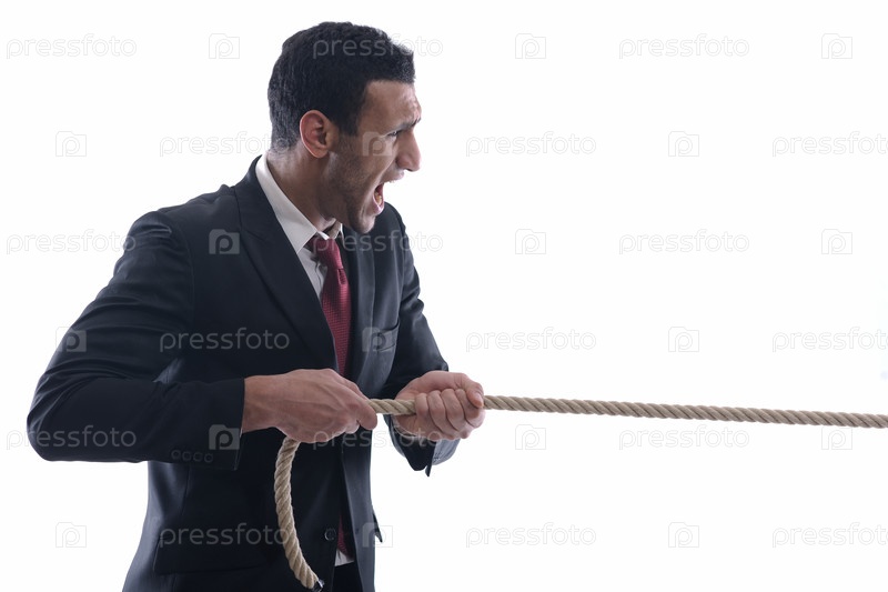 Деловой мужчина тянет за канат, изолирован на белом фоне