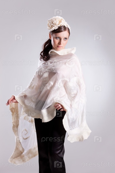 Молодая привлекательная женщина, одетая в модную ручную одежду на изолированном фоне